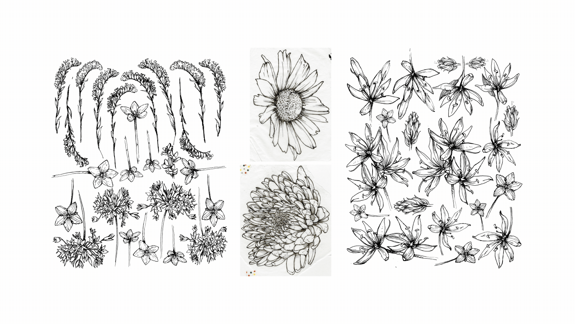 Process (Sage’s flower sketches, my layouts & rough comps using his sketches, final comp)